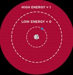 Outro dos meios para obter qubits é recorrer aos níveis de energia dos eletrões em átomos neutros ou iões que, no seu estado natural, ocupam o estado de menor energia possível. Se forem excitados com recurso a lasers, passam para um nível de energia superior, sendo possível atribuir ao qubit o valor 0 (estado de baixa energia) ou o valor 1 (estado de alta energia), tal como mostra a figura seguinte: